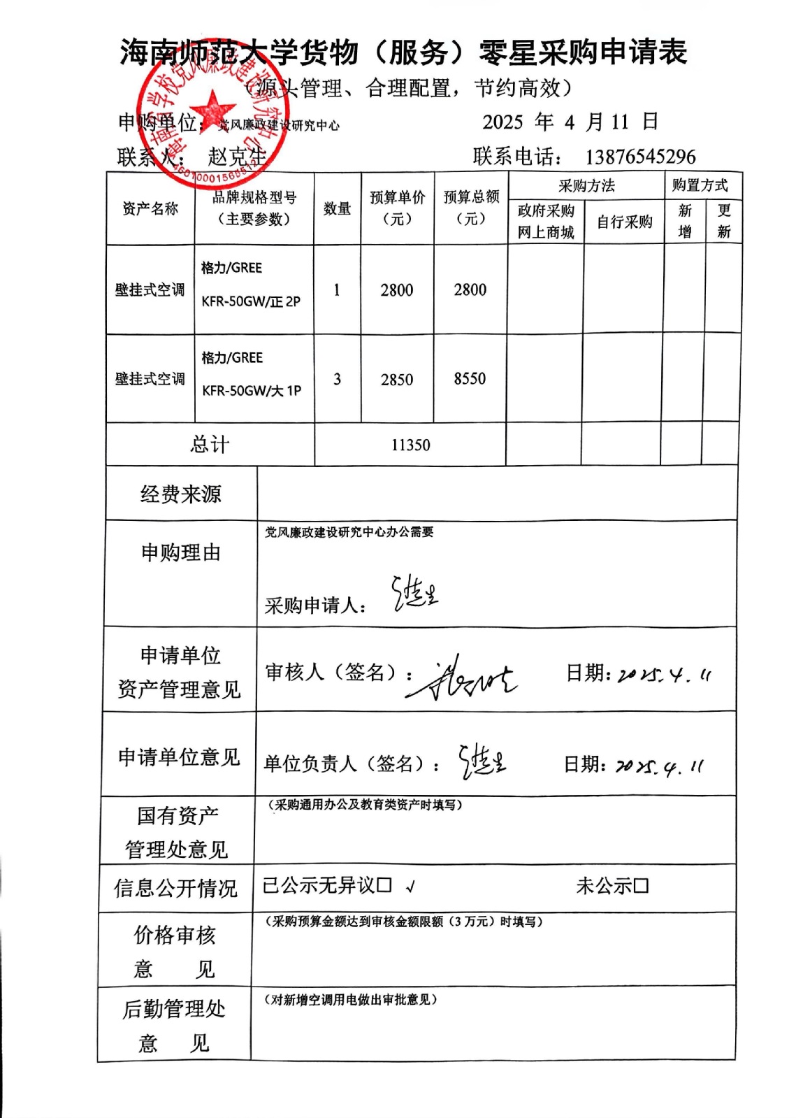 关于赵克生老师购置壁挂式空调的公示