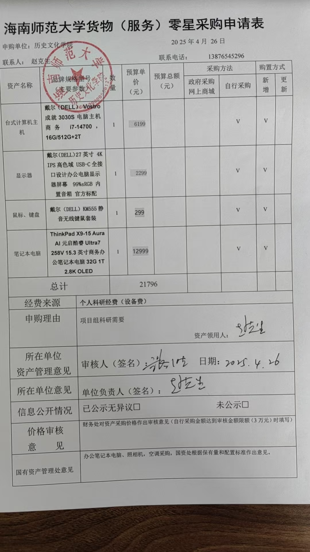 关于赵克生老师购置台式电脑以及笔记本电脑的公示