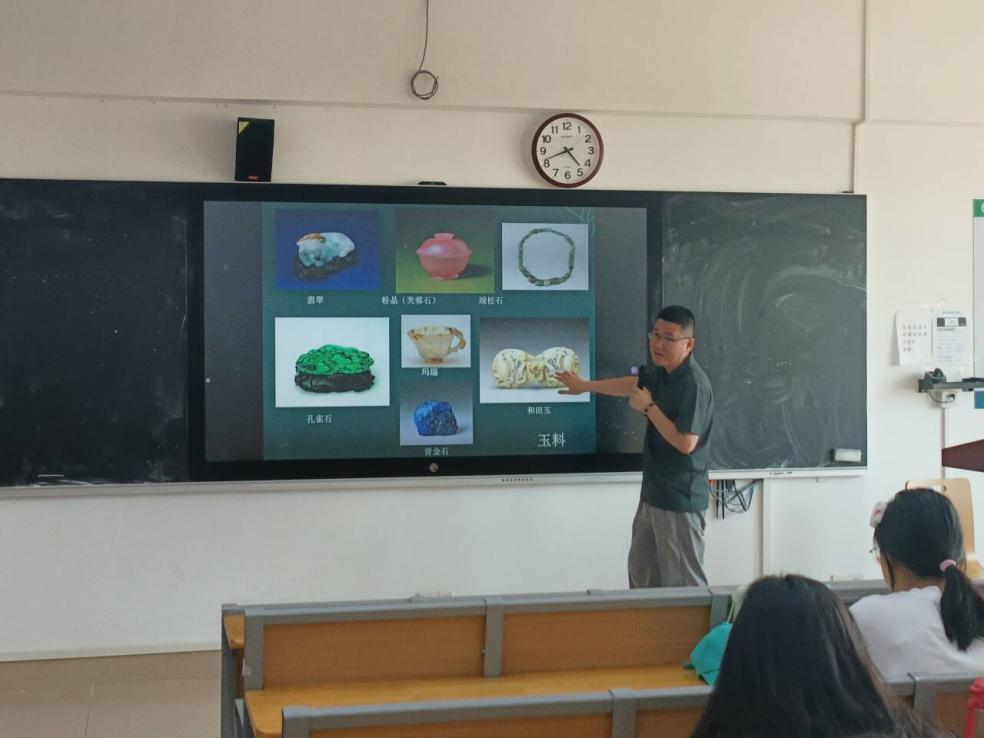随后,刘亭亭老师以翡翠为例,向我们讲解了翡翠的概念、分类与鉴别等,介绍的同时不忘向同学们传授在生活中对翡翠的鉴定与选择的方法。在讲授的同时,刘老师还依次将所讲玉石的实物交给同学们互相传阅查看。在刘老师的娓娓道来下,同学们细细感受着玉石的纹理在手心的感触,大家对于玉石的印象与认识渐渐加深。此外,刘老师所讲述的“和氏璧的未解之谜”引起了同学们的兴趣,大家纷纷沉浸在这一场美轮美奂的玉石盛宴中。