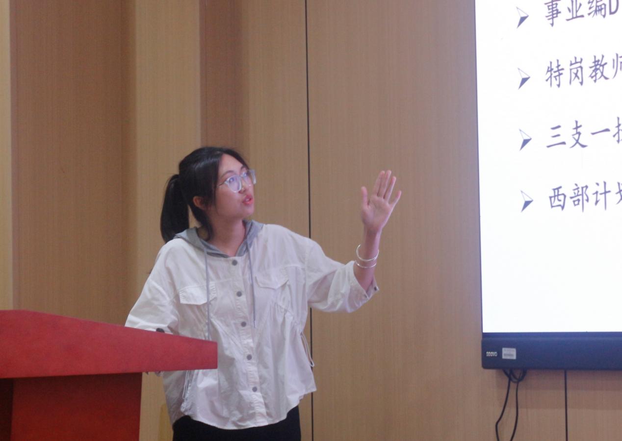 朱舒静、曹莉颖、张家慧三位同学根据自己的考编校招经验,按模块进行了精简总结:首先,她们建议同学们在校招前期做好信息收集,聚焦目标地区,善用信息差异减少竞争压力。其次在笔试备考策略方面,应首先熟悉考试内容,前期注重知识体系梳理与基础巩固,后期针对薄弱环节进行重点突破。在最后的面试环节,她们建议融入"教、学、评"一体化设计理念,通过课程设计答辩展示教学能力。为帮助同学们更好地理解,张家慧同学还特别准备了生动的教学示范课进行现场演示。最后是实战心法:保持心态平和与充分自信,用最佳状态迎接挑战。