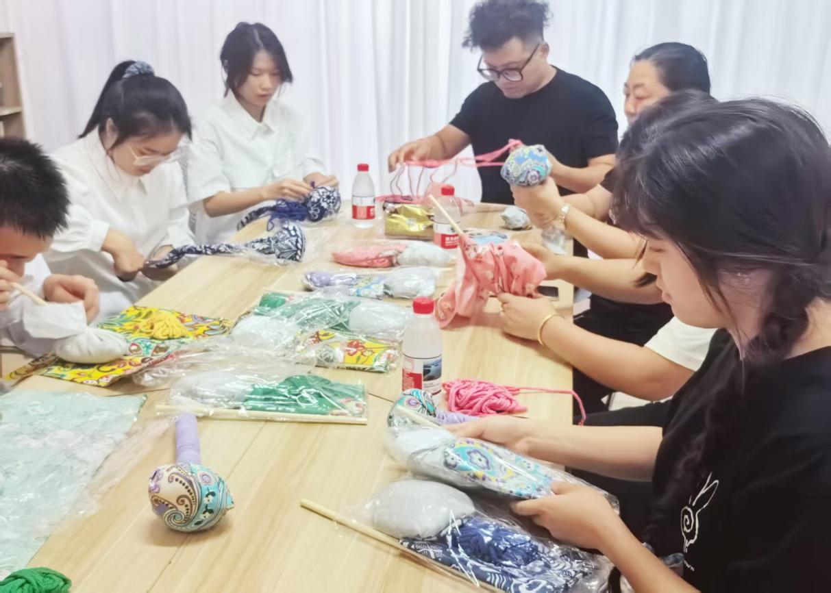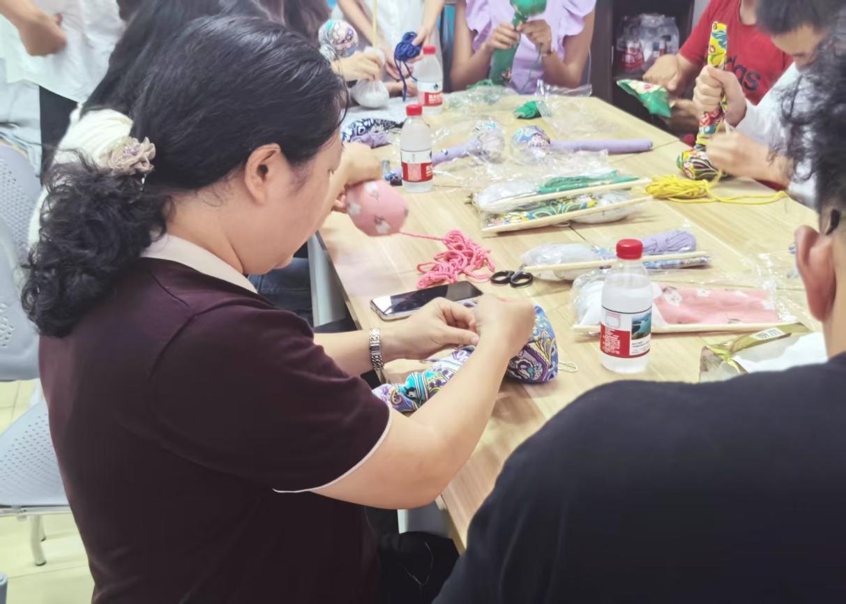 活动现场,大家围坐桌前一同制作艾草锤。裹紧草药的布囊被嵌入开孔檀木柄,随后用五颜六色布包裹起来,棉线在锤颈处细细的缠绕九九八十一圈——寓意“长长久久”。大家一边做一边讲述着儿时端午的回忆,谈论声和笑声阵阵,期间郭雷鸣老师还向同学们讲述了有关端午节制作艾草锤习俗的由来:艾草锤的诞生源于传统艾灸疗法,为了方便使用,现代工匠将艾草与锤子结合,这才制作出艾草锤。
