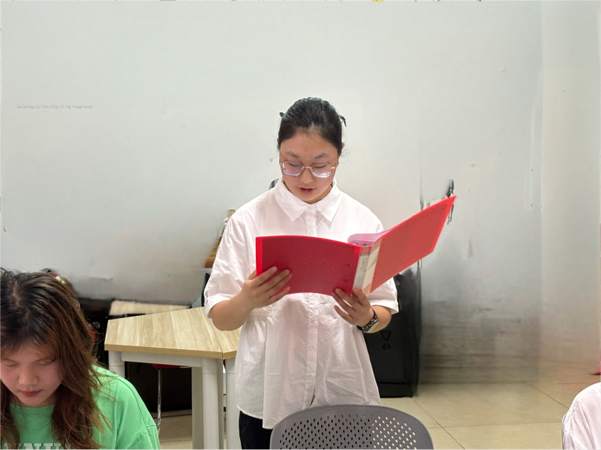 张艺萱同学分享了她对《乙卯重五诗》的感悟,“这首诗具体描写了当时人们在端午节这天的生活习惯。平淡的闲言琐事在诗人的笔下变得瑰奇纯粹。诗人把生活的真味都寄托在端午生活的描写中,仔细阅读,方有所悟。”