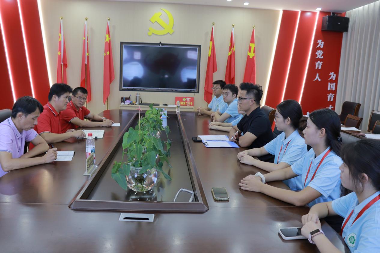 2025年7月20日17:30分,海南师范大学历史文化学院“海岛筑梦,不负‘史’命”三下乡支教团与澄迈二中学校领导在澄迈二中会议室举行座谈会,参加本次座谈会的有:澄迈县第二中学党总支书记蔡兴强、副校长王昌煜、党建办主任吴清仕、历史文化学院团委书记郭雷鸣以及部分学生干部。