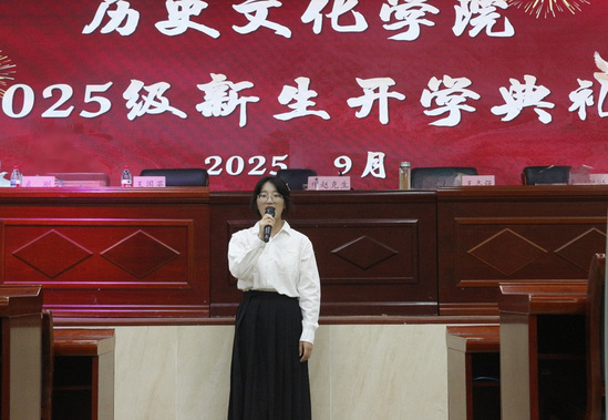 随后,2023级本科生代表陈莎莎同学发言。陈莎莎同学结合个人学习工作经历向新生们分享了三点体会:一是“以史为鉴,知行合一”,作为历史学子,需深耕专业并注重实践,在实践中感悟历史的温度与力量;二是“脚踏实地,勇于担当”,她鼓励新生积极参加学生组织,在学生工作中提升自我;三是“心怀热忱,向阳生长”,她祝愿新生保持热忱,兼顾钻研与实践,在活动中绽放自我。