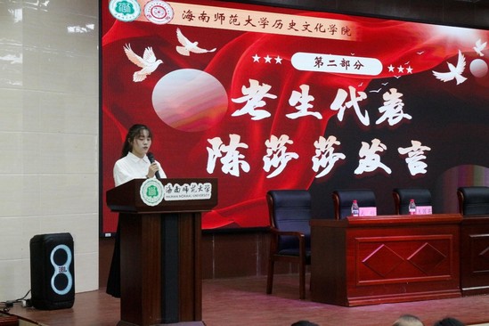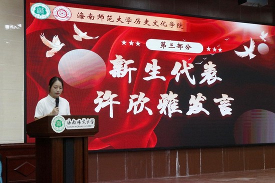 接着,研究生新生代表许欣雅同学发言。在发言中,她首先感谢海南师范大学与历史文化学院提供深造机会,让自己能继续以“海师历史人”的身份开启新征程。谈及未来,她表示将与同学们怀揣对知识的敬畏与对未来的憧憬,牢记“弘毅明德、鉴古知今”的院训,继续踏实学习,精研学问,力争在新的阶段继续取得进步。