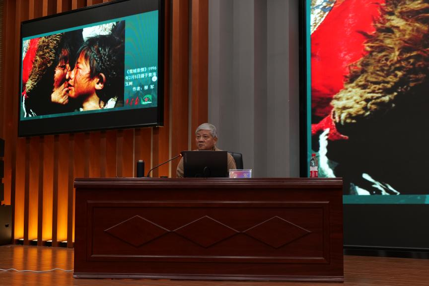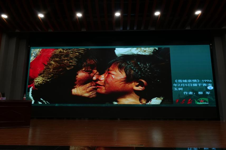 镜头有温度,影像有态度。柳军告诉在座观众,摄影追求三真:真心、真情、真诚。他用个人代表作品与大家进行分享和交流。柳军将一张张震撼人心的照片背后的故事娓娓道来,摄于青海玉树的《雪域亲情》反映饥寒交迫中的亲情;《不要忘记他们》记录下为了国家过了民族英勇就义的战士们;《我们的队伍向太阳》展现新时代的中国军人形象......柳军说摄影中最有感染力的就是瞬间,是人间真情。柳军一生见证诸多时代变革,他用影像记录下中国不同历史发展时期的珍贵瞬间,那些时代、镜头和人,传奇且动人。