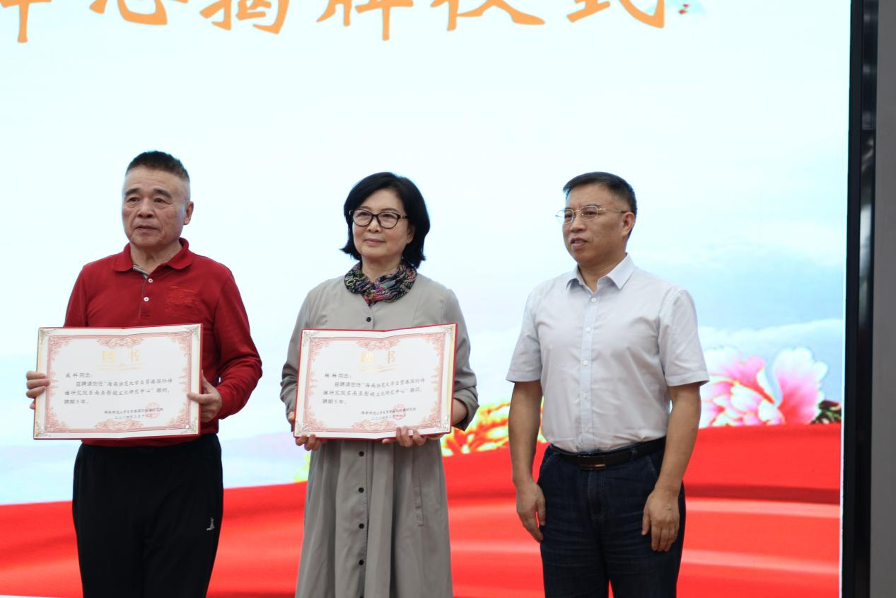 海南师范大学人文社会科学院院长罗璠为中心顾问成科导演和杨杨少将颁发了聘书。