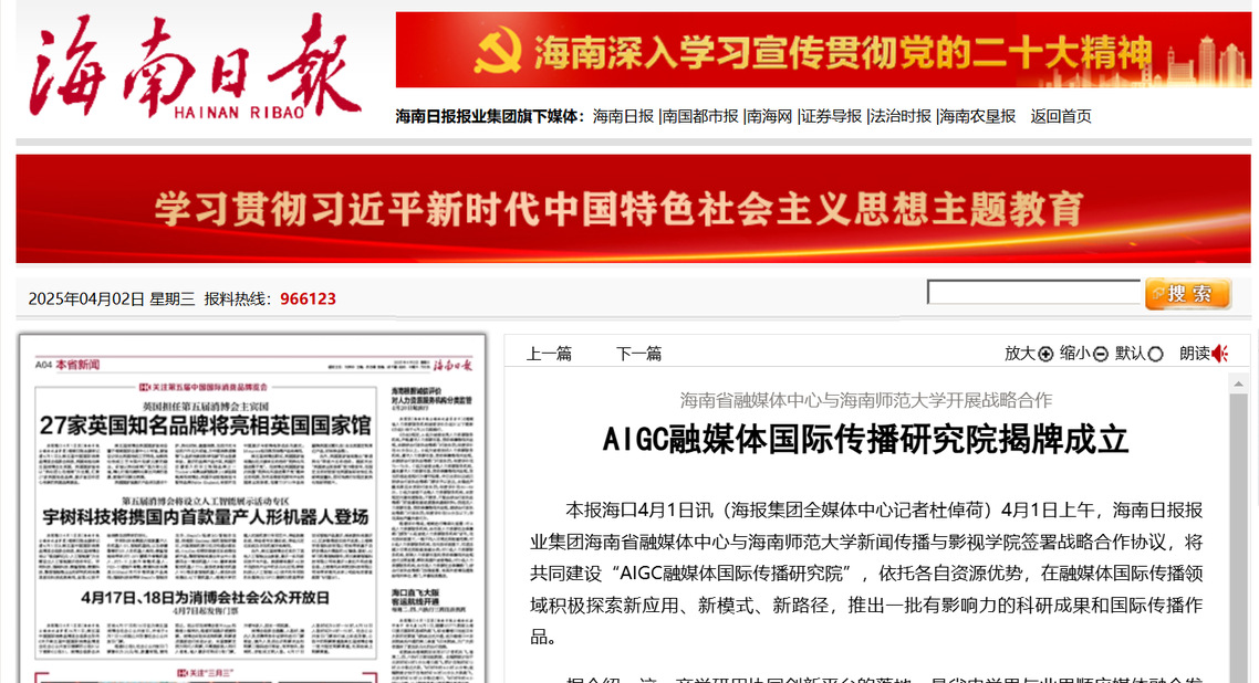 2025年4月1日,海南日报报道:海南省融媒体中心与海南师范大学开展战略合作AIGC融媒体国际传播研究院揭牌成立,海南省人民政府网今日海南频道转载。