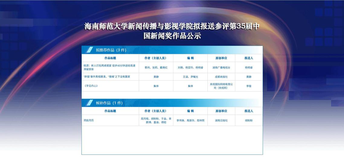 现予以公示5个工作日,公示日期为2025年5月29日至6月5日。欢迎社会各界监督、评议,如有意见,可通过电话、邮件、书面信函等方式,于6月5日17时前向海南师范大学新闻传播与影视学院反映。