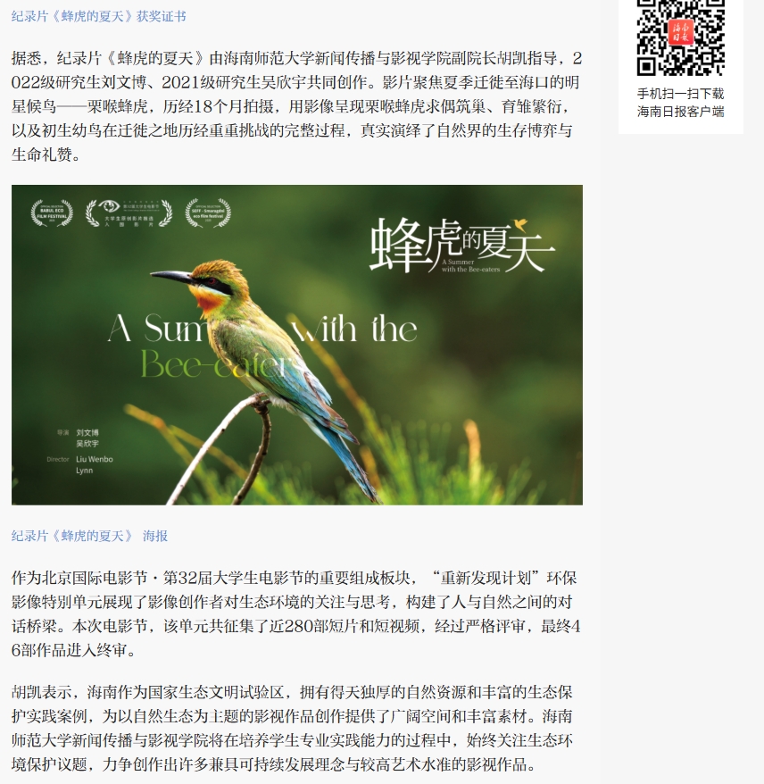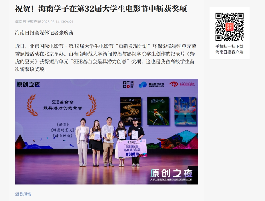 海南日报报道我校 | 祝贺!海南学子在第32届大学生电影节中斩获奖项