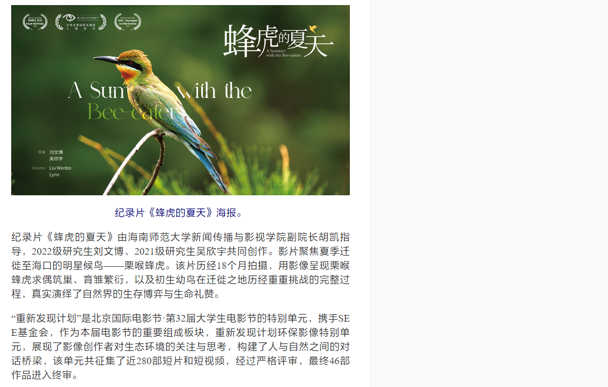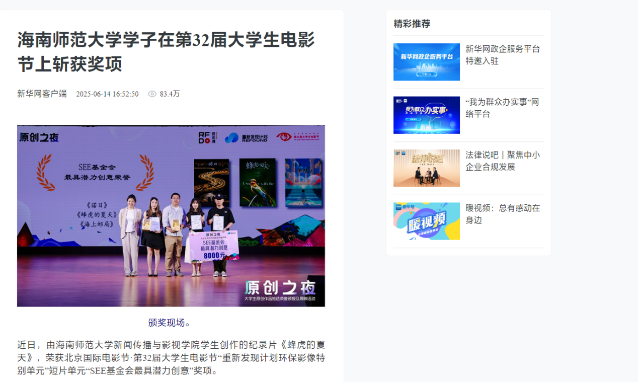 2025年6月14日,新华网报道:海南师范大学学子在第32届大学生电影节上斩获奖项