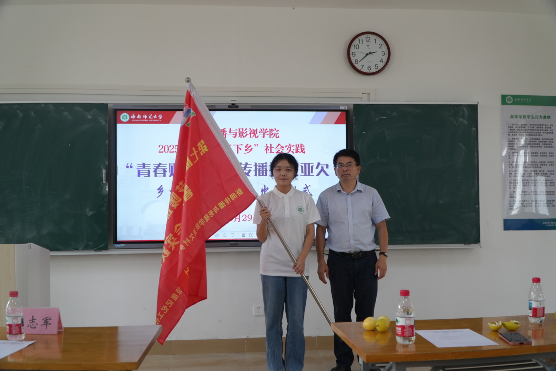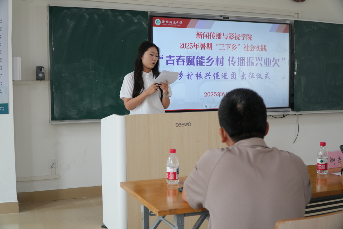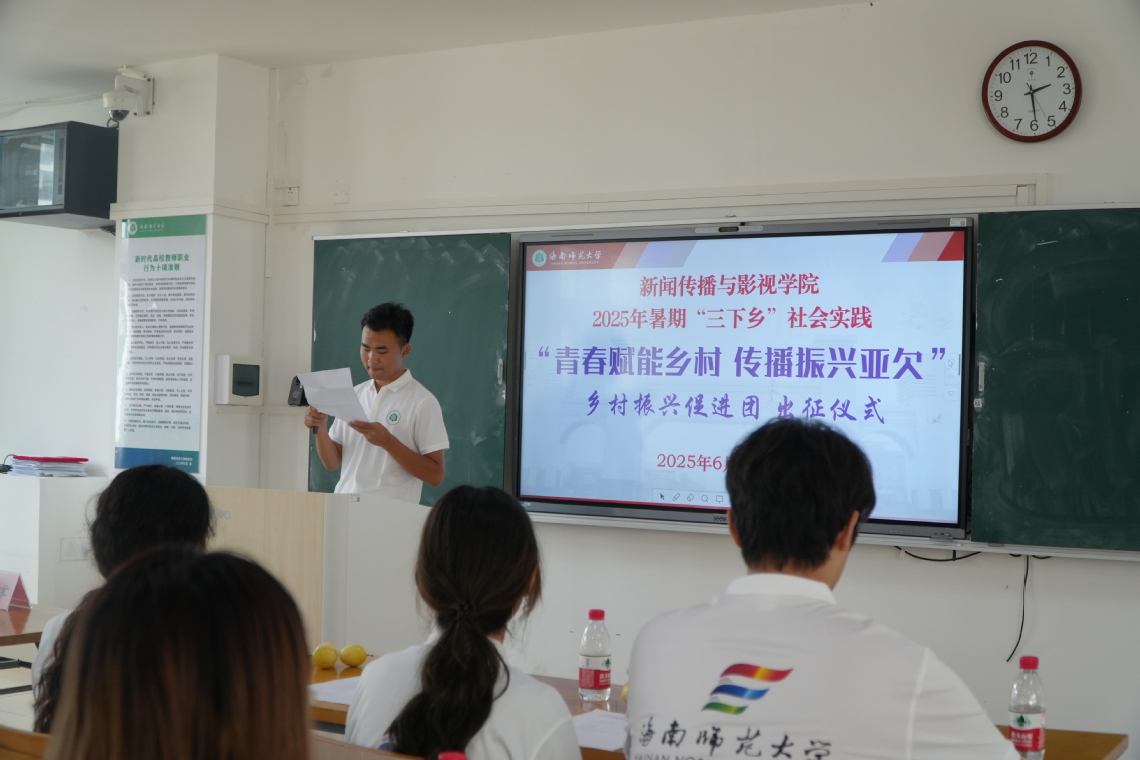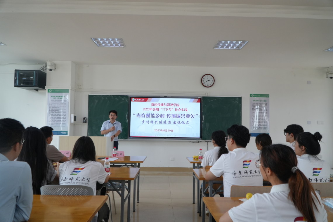 2025年6月29日下午2:00,海南师范大学新闻传播与影视学院第七届艺暖琼岛“青春助力乡村·传播振兴亚欠”乡村振兴促进团出征仪式在桂林洋校区文学楼305教室举行。新闻传播与影视学院卿志军院长,学校定点帮扶陵水本号亚欠村第一书记、乡村振兴工作队队长雷小明同志以及实践团全体成员出席,出征仪式由带队老师李唯正主持。