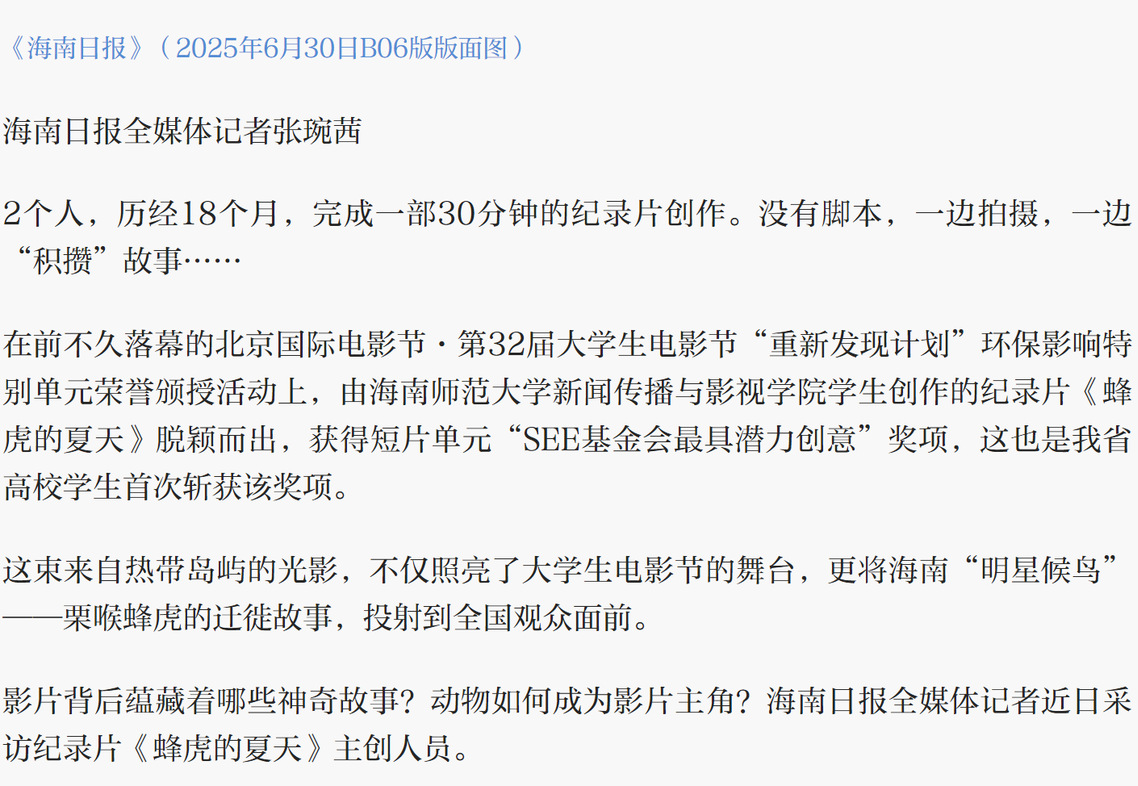 2025年6月30日,海南日报报道海南师范大学纪录片《蜂虎的夏天》斩获大学生电影节奖项