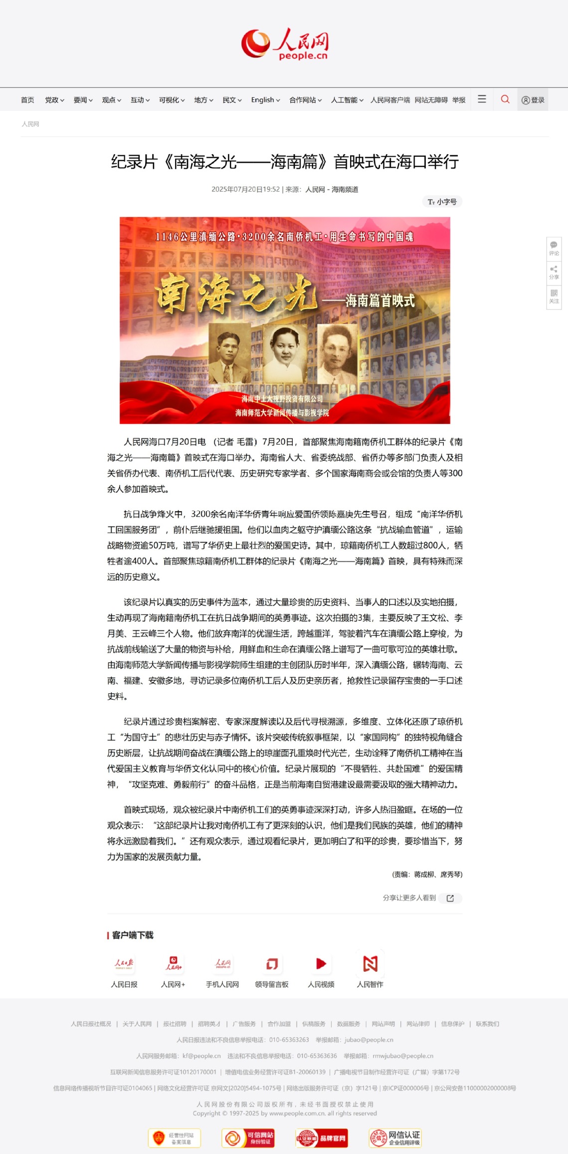 人民网报道我校,纪录片《南海之光——海南篇》首映式在海口举行