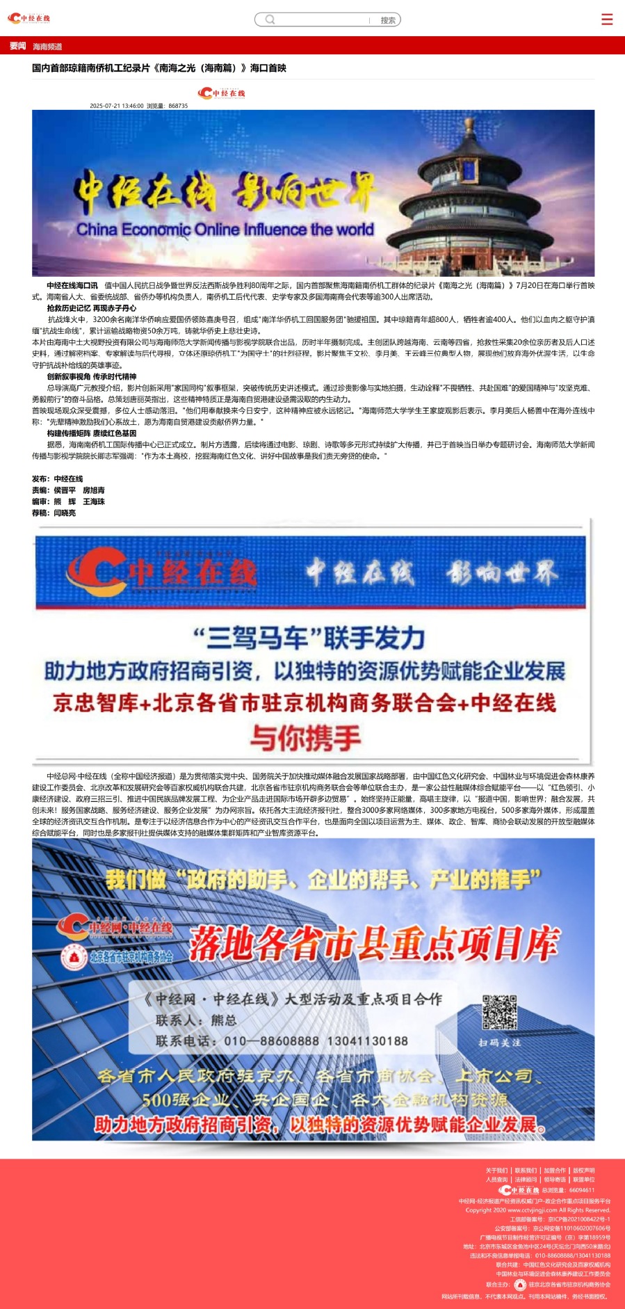 2025年7月21日,中经在线报道我校|国内首部琼籍南侨机工纪录片《南海之光(海南篇)》海口首映。