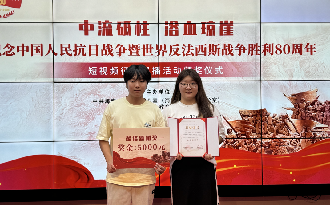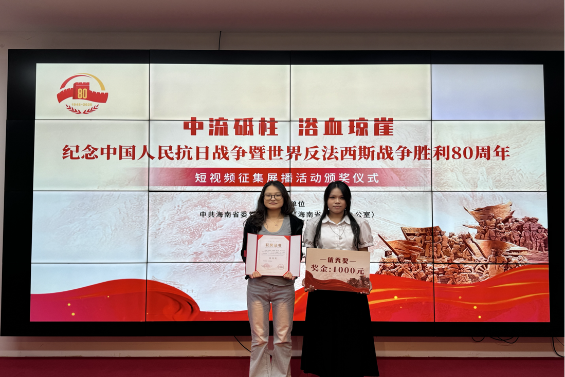 9月7日上午,“中流砥柱 浴血琼崖”——纪念中国人民抗日战争暨世界反法西斯战争胜利80周年短视频征集展播活动颁奖仪式在海南省史志馆举行。本次征集展播活动共评选出15个获奖作品,我院选送的2项短视频作品均获奖,学院获最佳组织奖。其中,孙才植、杜斯阳、丁家文学生团队创作的短视频作品《赤子归处是家国》获最佳题材奖,指导老师为胡凯;马邢、马慧敏、罗海玥、俱子莹学生团队创作的短视频作品《烽火琼花》获优秀奖,指导老师为熊越。