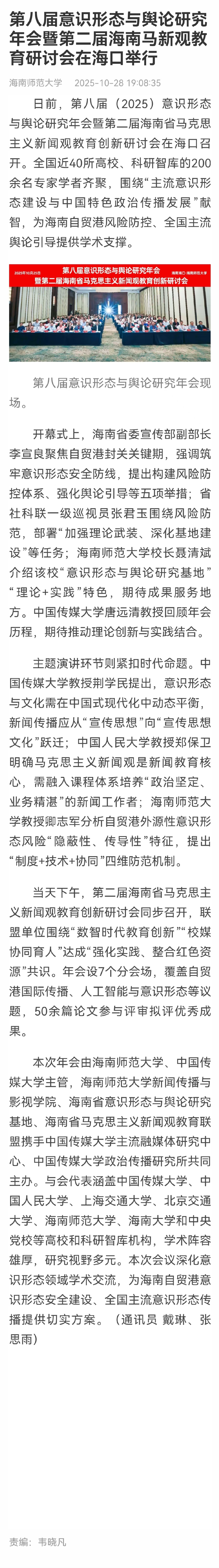新海南报道,第八届意识形态与舆论研究年会暨第二届海南马新观教育研讨会在海口举行。