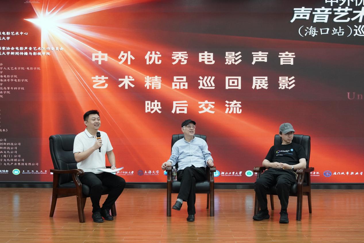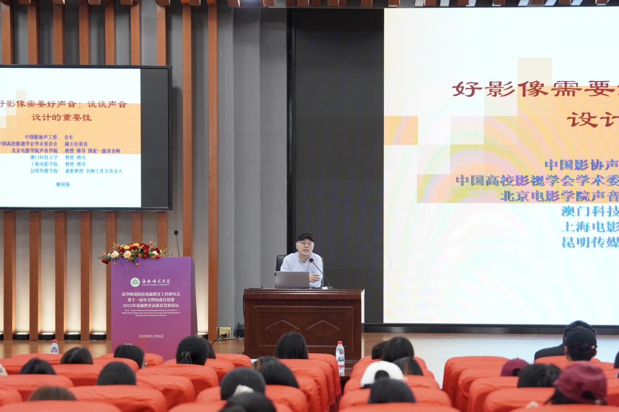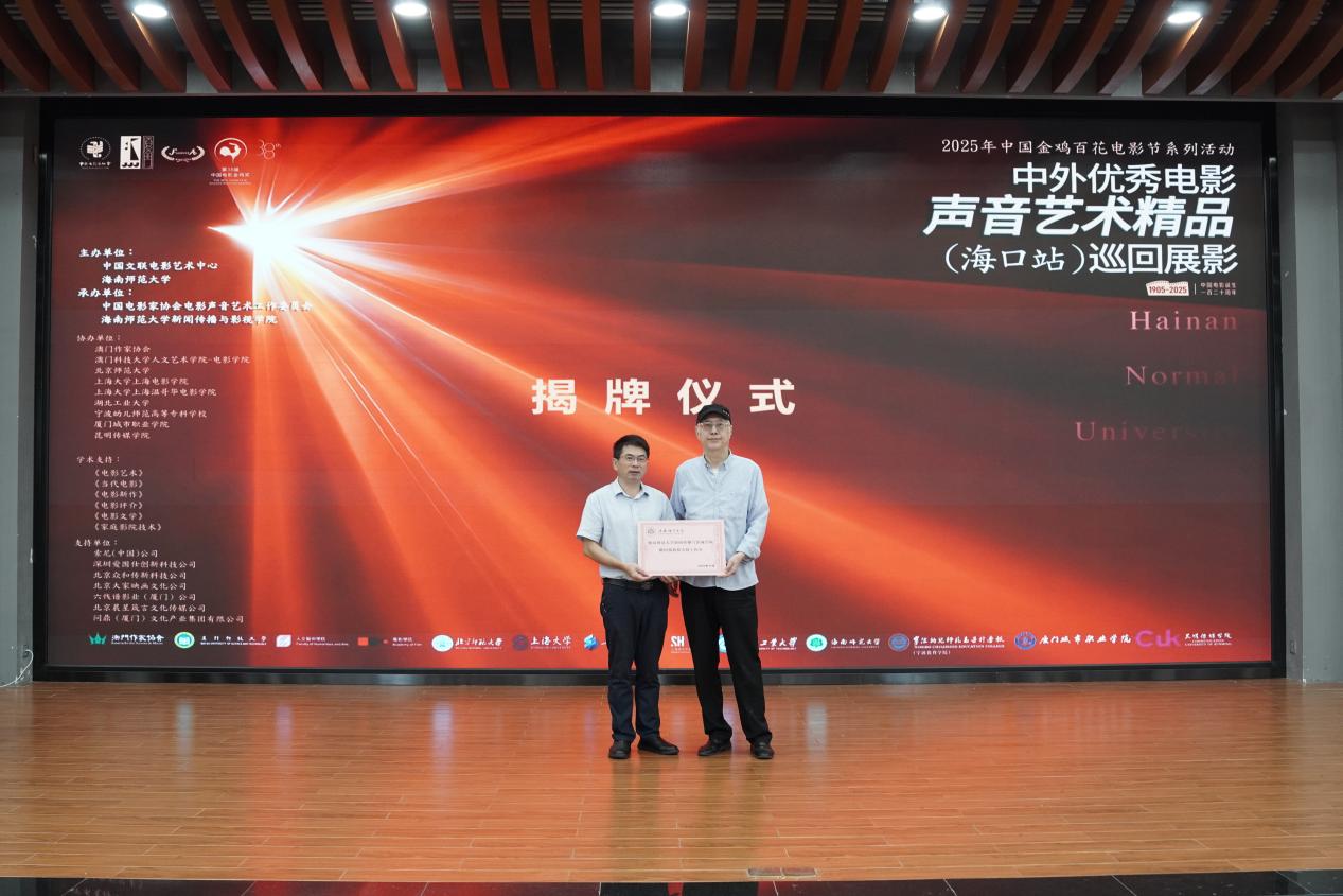 11月9日,2025年中国金鸡百花电影节系列活动之中外优秀电影声音艺术精品(海口站)巡回展影学术讲座,在海南师范大学我校桂林洋校区图书馆隆重举行。本次活动由我校与中国文联电影艺术中心、海南师范大学联合主办,我院与中国电影家协会电影声音艺术工作委员会与海南师范大学新闻传播与影视学院共同承办。海南师范大学新闻传播与影视学院副院长李楠副教授主持活动,中国电影家协会电影声音艺术工作委员会会长姚国强教授、秘书长侯明副教授,三亚电影电视家协会副主席战胜,学院院长卿志军教授、中国电影家协会电影声音艺术工作委员会会长姚国强教授、秘书长侯明副教授,三亚电影电视家协会副主席战胜,学院教师代表吕永、许晶及近200名本科生、研究生共同参与此次活动。