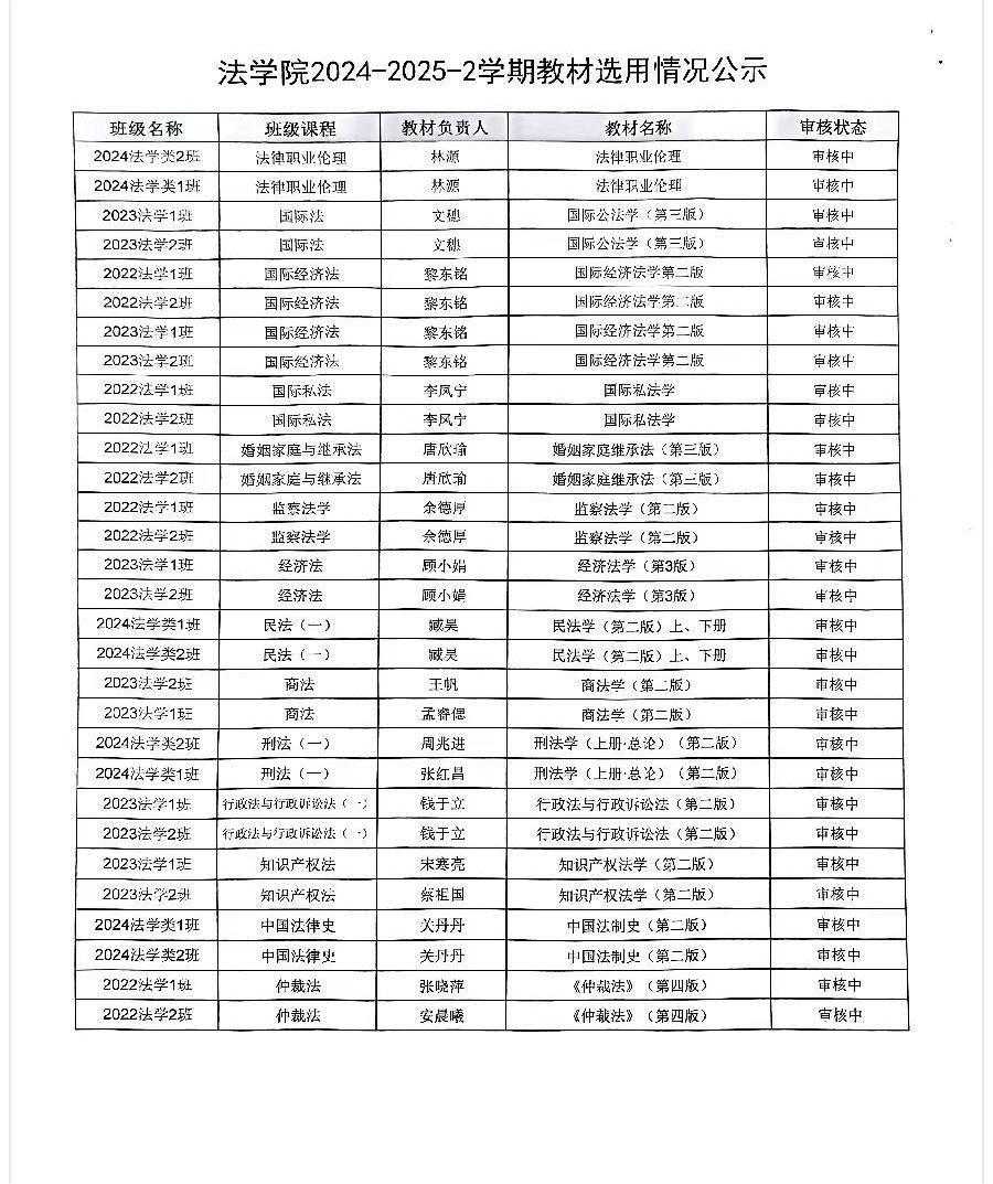 法学院2024-2025-2学期教材选用情况公示