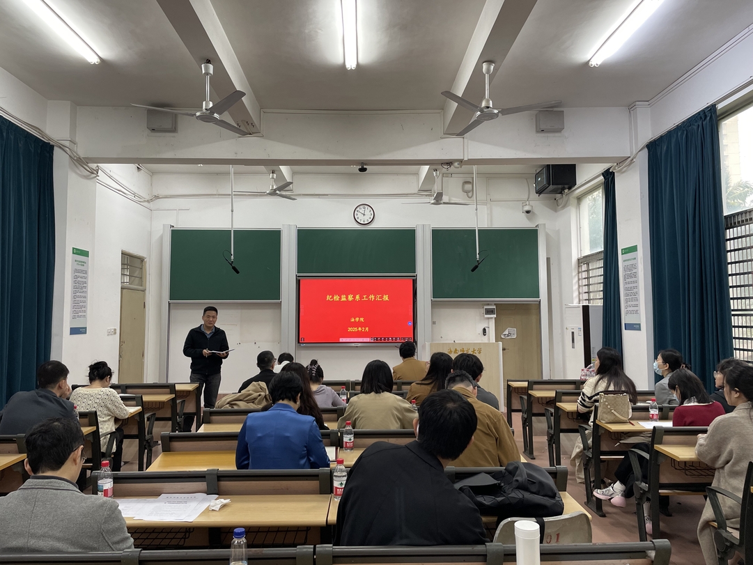 周兆进副院长详细介绍了学院纪检监察系的建设情况,对2023级纪检监察特色班遴选设立等情况作了详细汇报。通报了学院在2024年暑假期间的对外交流工作,介绍了学院与澄迈县纪委监委合作开展培训班,组织学院专职教师为澄迈县纪委监委的工作人员进行法律课程培训的情况。