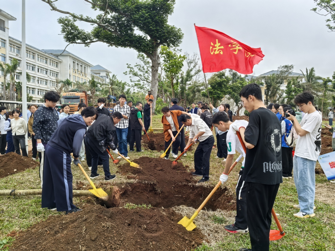 植树现场,师生分组协作,配合默契。挥锹培土、扶苗填坑、浇灌新苗……大家有条不紊地完成每一道工序,合力在规划区域内种下椰子树、黄花梨、榕树等数十株新树苗。