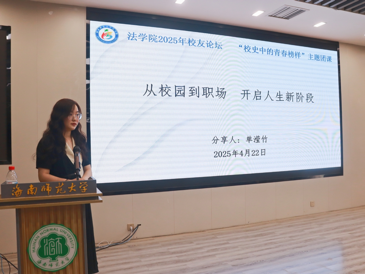 随后,单滢竹作为优秀校友为与会师生做了题为“从校园到职场,开启人生新阶段”的校友论坛主题分享。她以自身经历向大家分享了如何做好从校园向职场的转变,鼓励大家在校时夯实个人学识,积极参与实践,为走向职场做好准备。随后,她向大家介绍了四川辞鉴(海口)律师事务所的发展概况与律所文化,并欢迎大家加入律所大家庭。