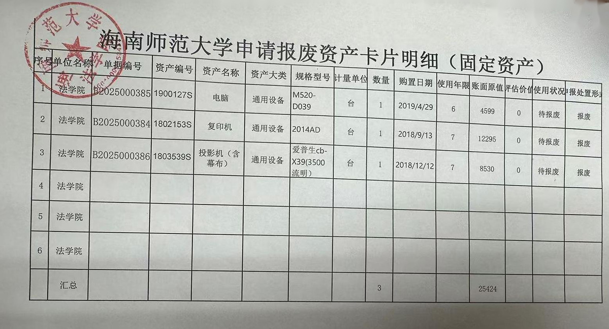 按照学校国资处相关文件要求,学院拟对办公室、实验室等固定资产进行报废处置。根据《海南省省直行政事业单位固有资产管理暂行办法》有关规定,经组织鉴定小组对拟报废处置国有资产进行了鉴定和评估,一致认为该批资产已达或超过使用年限,不能满足正常的管理工作需要,符合报废处置条件,拟作报废处理,现予以公示。