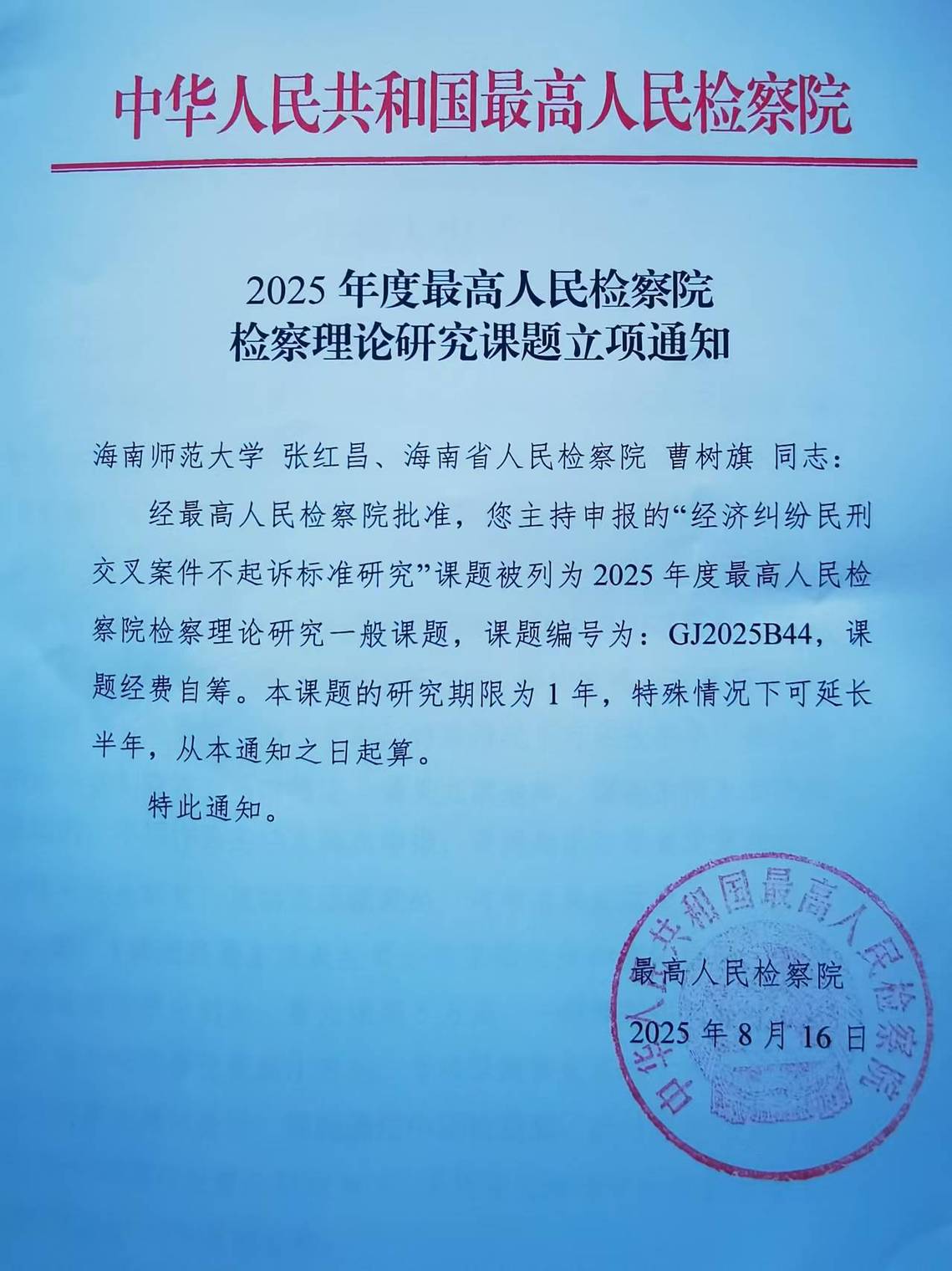 我院张红昌教授与海南省人民检察院曹树旗检察官联合申报的2025年度最高人民检察院检察理论研究课题“经济纠纷民刑交叉案件不起诉标准研究”喜获批准立项,批准号GJ2025B44。