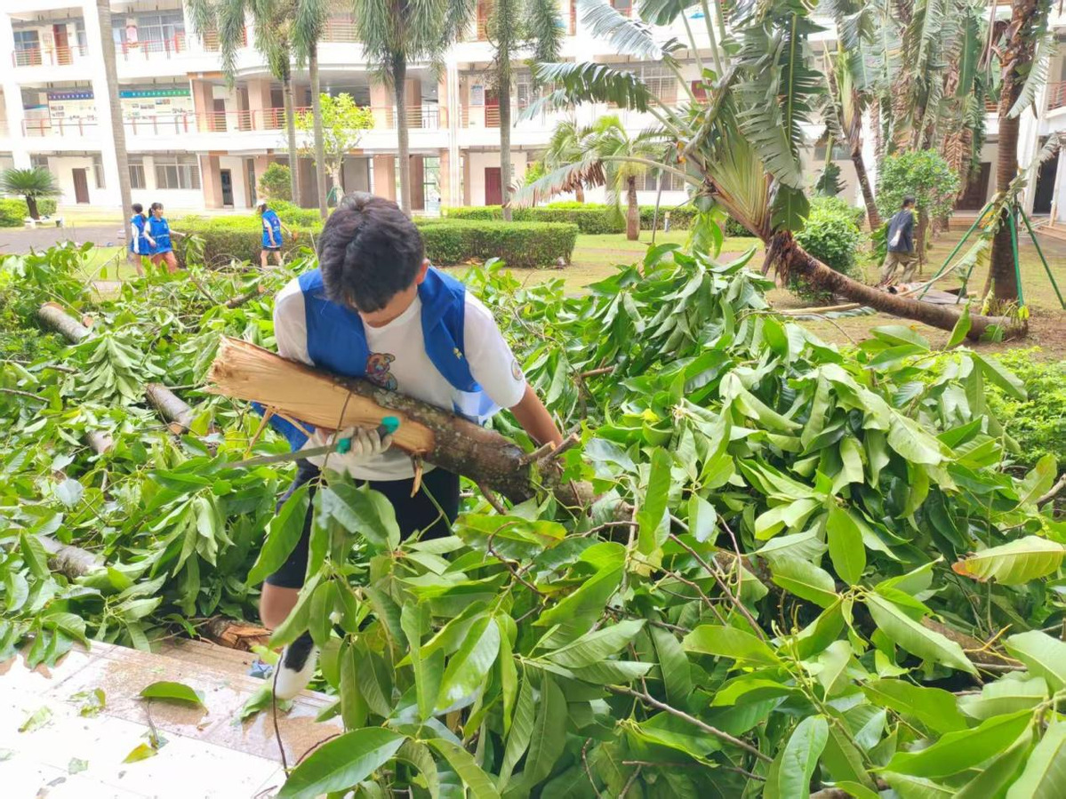 师生齐心协力搬运倒下的树枝