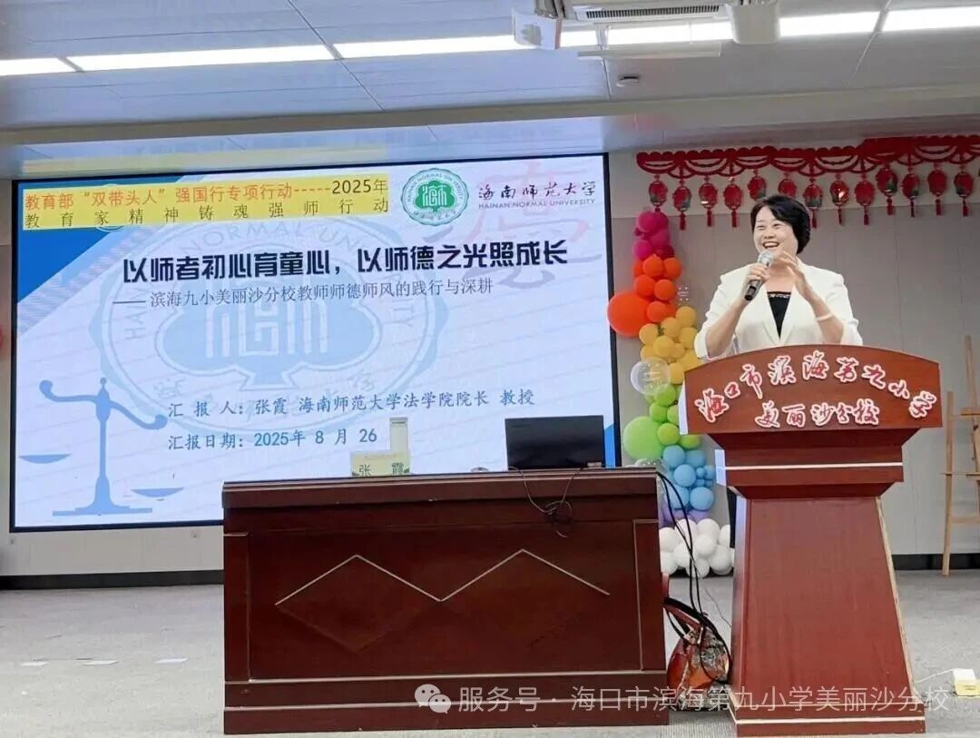 为强化教师队伍建设、提升教师职业道德素养、筑牢立德树人思想根基,2025年8月26日上午,海口市滨海第九小学美丽沙分校举办“以德立学,以德施教”师德师风培训活动。我院张霞教授应邀主讲,该校校领导及250余名教师参会,活动由陈青蔓老师主持。
