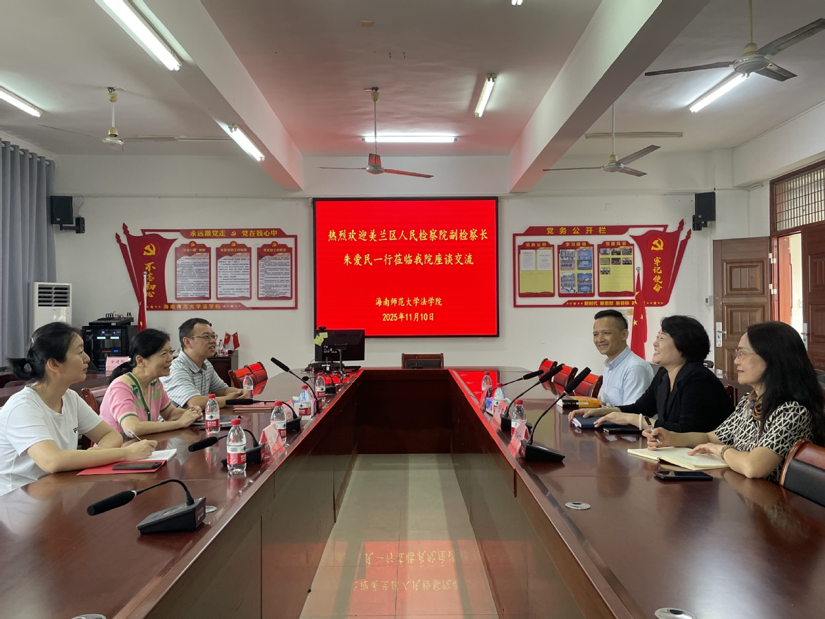 11月10日上午,美兰区人民检察院副检察长朱爱民、政治部主任文健、研究室负责人赵婕一行到法学院访问。张霞院长、李秋花副书记、张红昌老师参加座谈。
