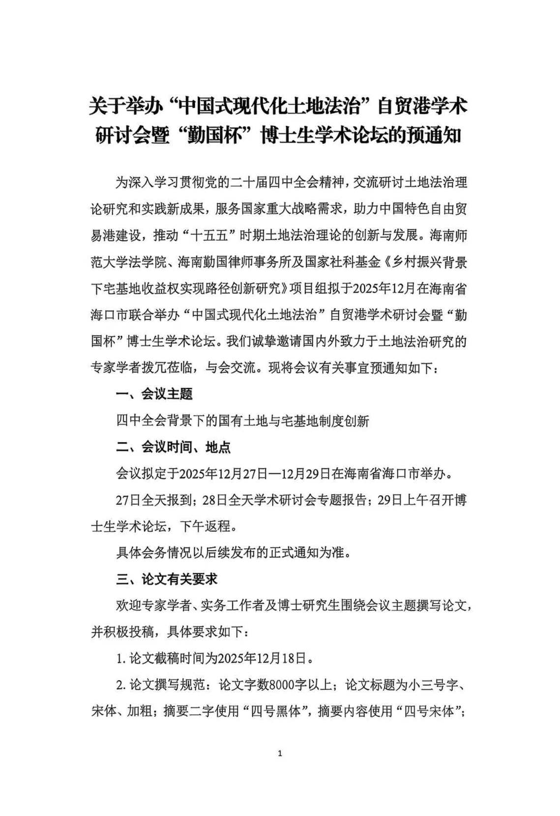 关于举办“中国式现代化土地法治”自贸港学术研讨会暨“勤国杯”博士生学术论坛的预通知