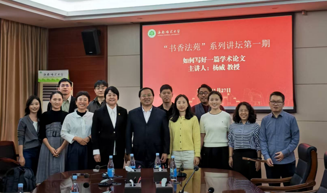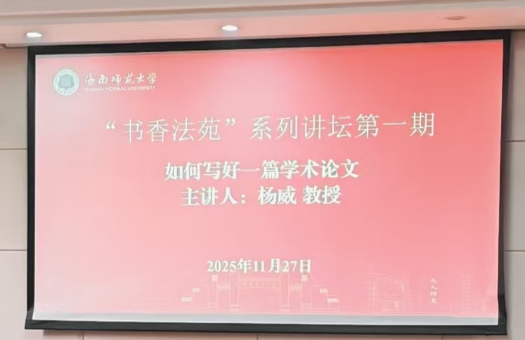 2025年11月27日下午,法学院在龙昆南校区第一办公楼三楼会议室成功举办“书香法苑”系列讲坛第一期活动。本期讲坛特邀《海南师范大学学报(社会科学版)》(CSSCI扩展版)主编、海南师范大学学报编辑部主任、马克思主义学院博士生导师(博士后合作导师)杨威教授,进行了题为“如何写好一篇学术论文”的学术交流和座谈。法学院院长张霞教授主持活动,学院教师与硕士研究生共40余人参加。