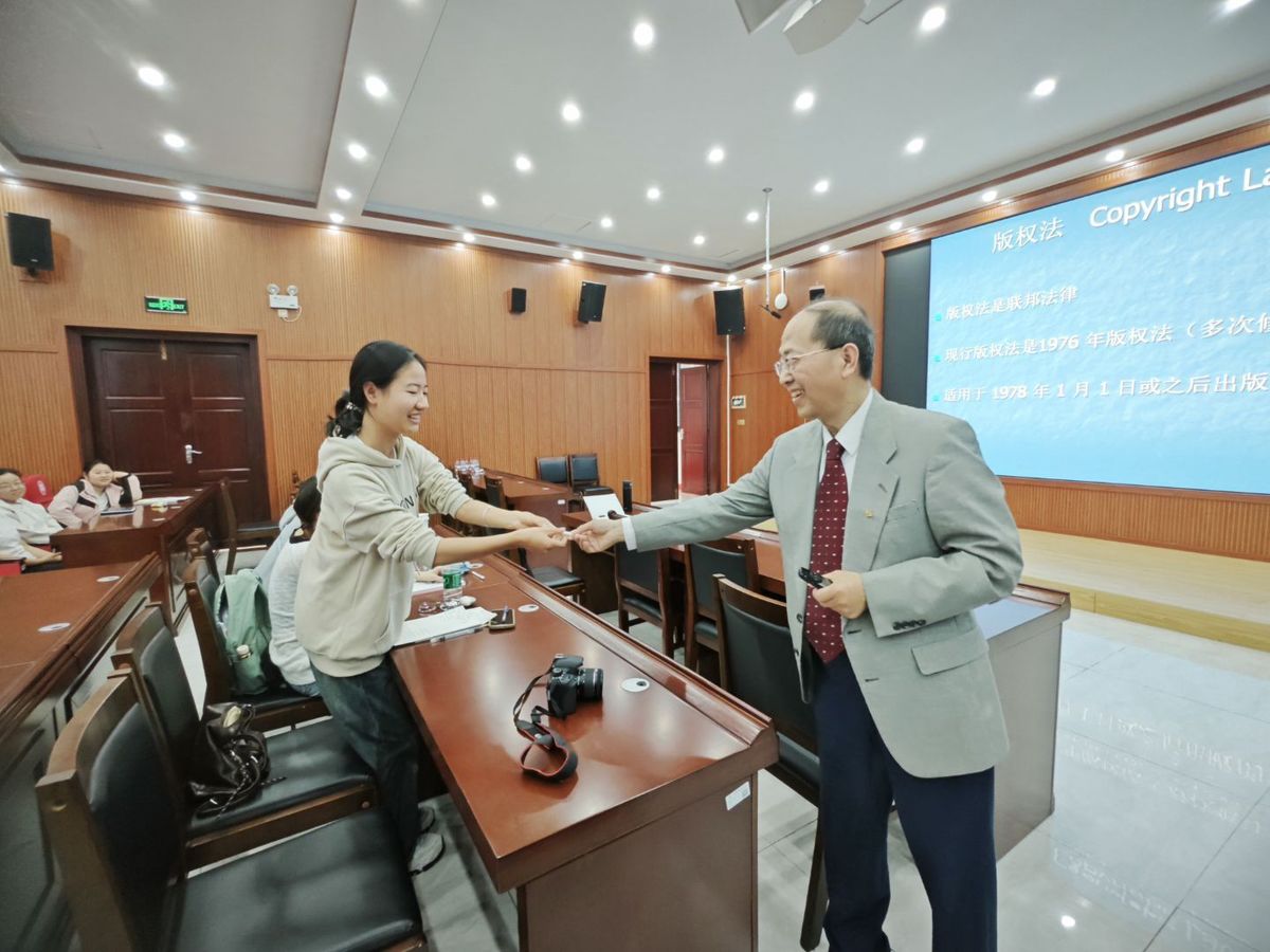 讲座过程中,胡海滨教授结合自身丰富的学术研究与实务经验,设置了多轮提问互动环节,还准备了美国圣玛丽大学文创产品作为互动礼品。他围绕美国知识产权法四大板块的核心知识点、中美贸易争议中的知识产权焦点问题设计提问,引导参与者主动思考、踊跃作答。现场互动氛围热烈。