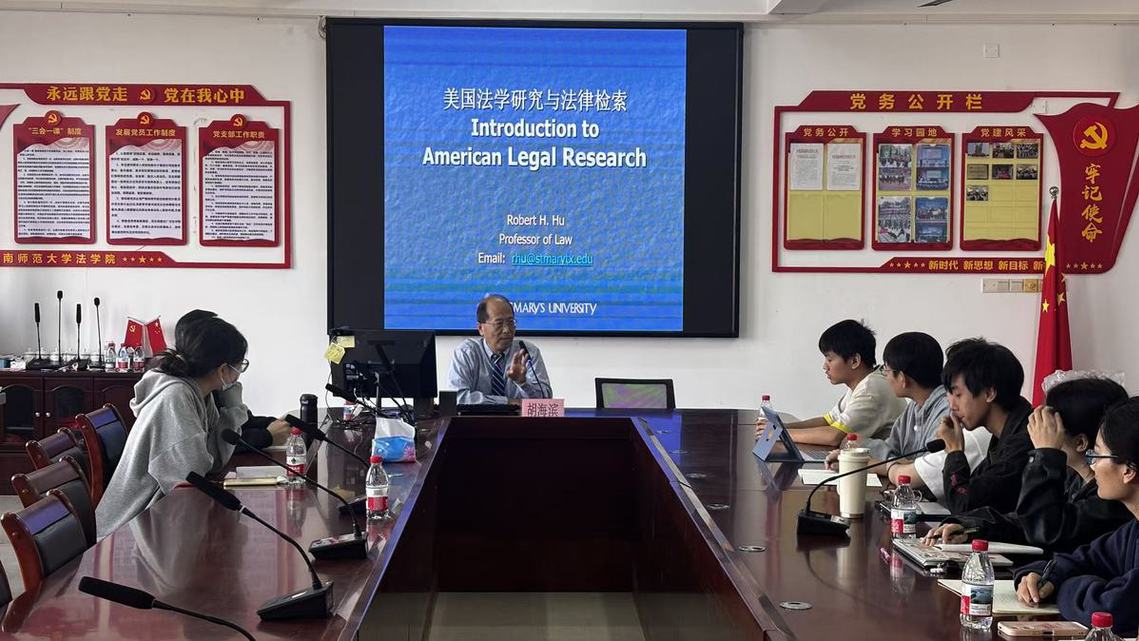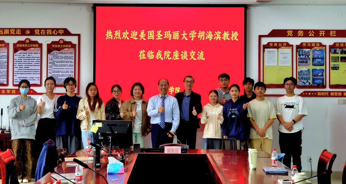 2025年12月9日上午,法学院在桂林洋校区第一公共楼三楼会议室举办“书香法苑”系列讲坛第四期活动,特邀美国圣玛丽大学法学院胡海滨教授座谈交流。法学院副院长宋寒亮副教授主持活动,我院全体硕士研究生和部分本科生代表参加交流。