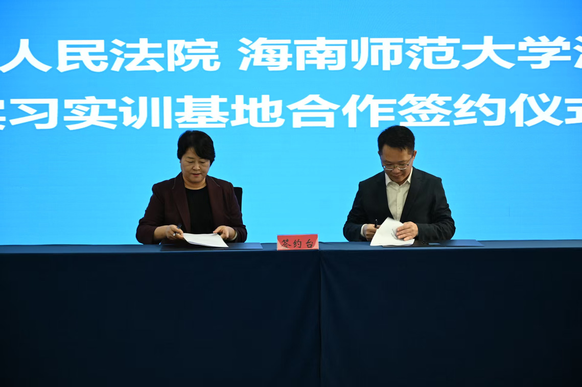 图一:海南师范大学法学院院长张霞与定安县人民法院党组书记、院长李雪刚签署实习实训基地合作协议