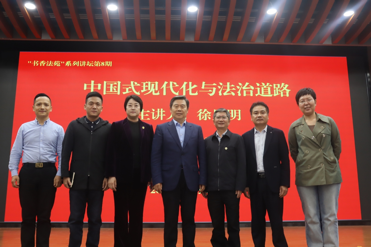 12月27日下午,我院“书香法苑”系列讲坛第8期在桂林洋校区图书馆一楼报告厅举行,特邀最高人民检察院咨询委员会副主任、教育部高等学校法学类专业教学指导委员会主任徐显明教授作题为《中国式现代化与法治道路》的专题报告。校党委副书记、校长聂清斌出席报告会,会议由校党委常委、副校长杨兹举主持。我院党委书记王承毅,院长张霞,副院长周兆进,教师代表张红昌、王伟,法律出版社法律翻译与出版研发中心主任朱峰,以及学院研究生、本科生、专升本学生代表共计三百余人参加报告会。