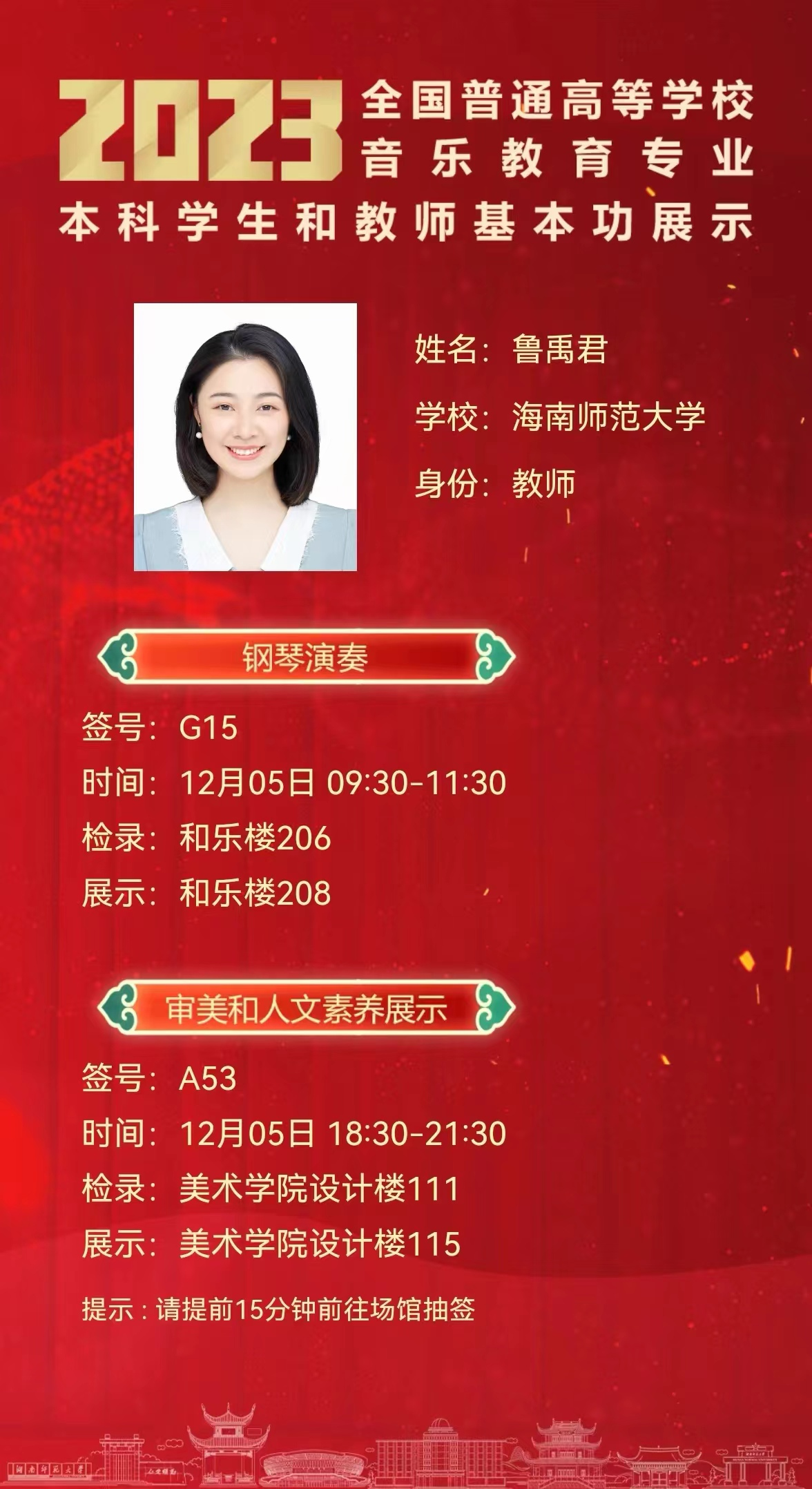 2023年12月,我代表海南师范大学的赴湖南长沙参加全国普通高等学校音乐教育专业本科学生和教师基本功展示。经过数日紧张备战,我们在12月7日顺利参赛,为这段经历画上了完美的句号。