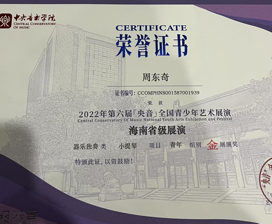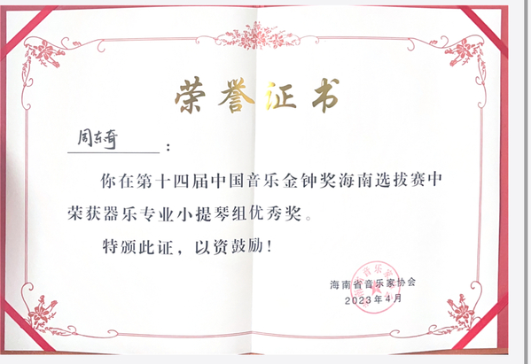 获2022年第六届央音全国青少年艺术展演海南省金奖