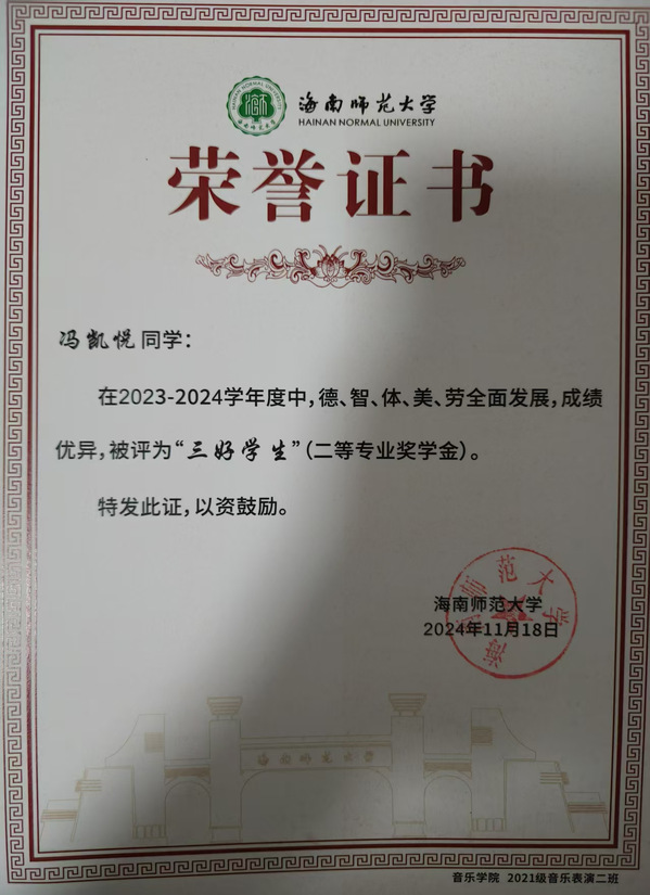 我是来自音乐学院2021级音乐表演二班的冯凯悦,师从李丽霞副教授,大学四年在音乐学院的学习生活中,我不仅收获了很多专业知识,同时还收获了很多志同道合的朋友,在这四年里我很感谢我父母对我的支持,同时非常感谢李丽霞老师以及同门师兄师姐们对我的帮助,是他们在我迷茫时指引方向,在我遇到困难时给予鼓励,让我能够坚定信心,勇往直前。在未来的日子里,我会继续努力,不断提升自己的专业素养和综合能力,为音乐事业的发展贡献自己的力量。