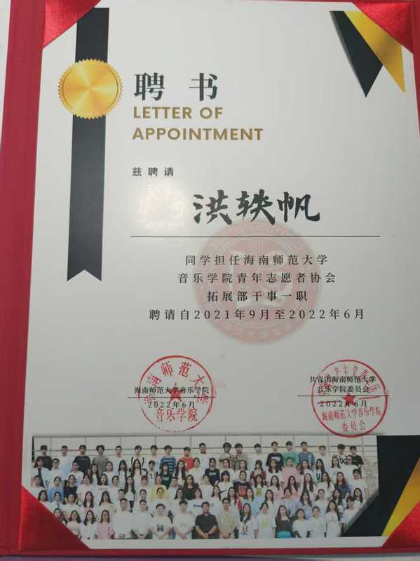 (5)担任海南师范大学音乐学院青年志愿者协会拓展部干事;