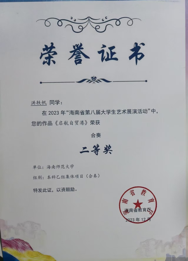 (3)获2023年海南省第八届大学生艺术展演活动获合奏二等奖;