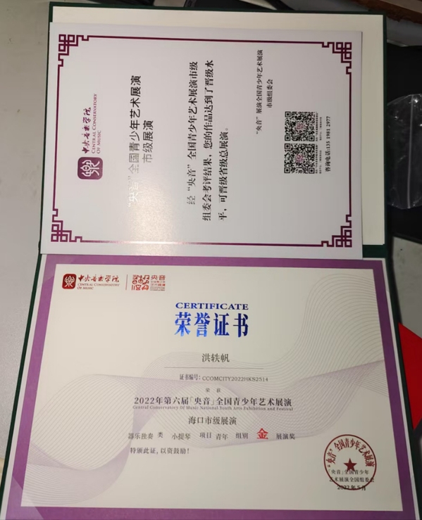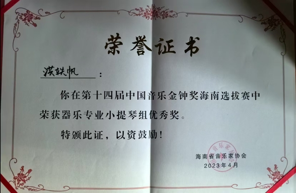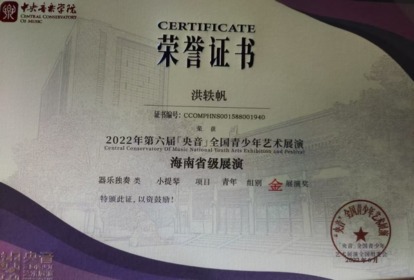 (2)获2022年第六届央音全国青少年艺术展演海南省级展演小提琴组金奖;