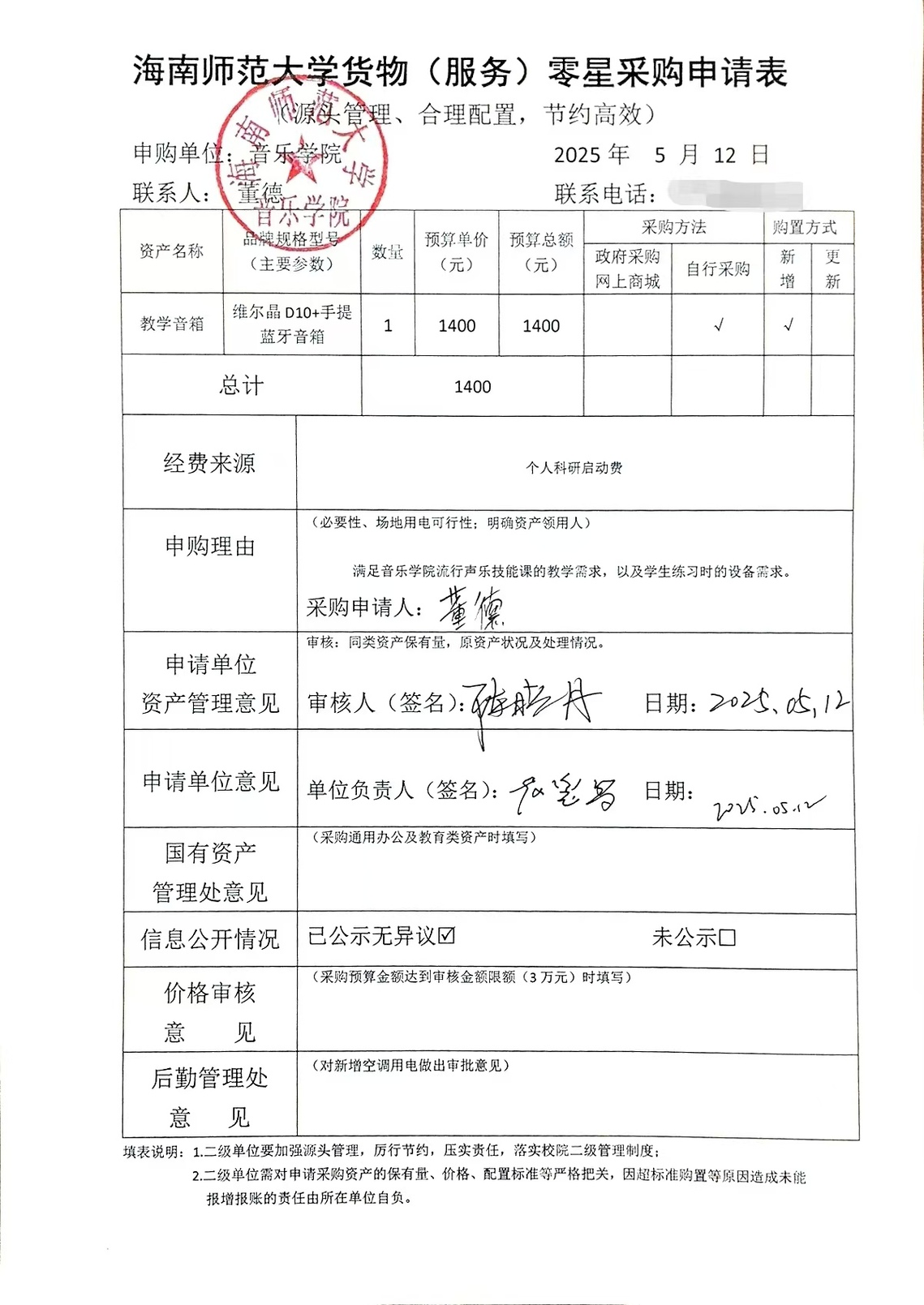 海南师范大学货物(服务)零星采购申请表公示