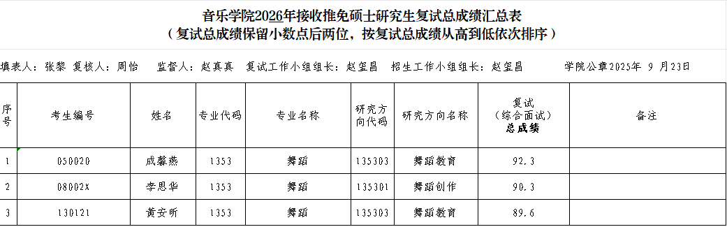 音乐学院2026年接收推免硕士研究生复试总成绩公示