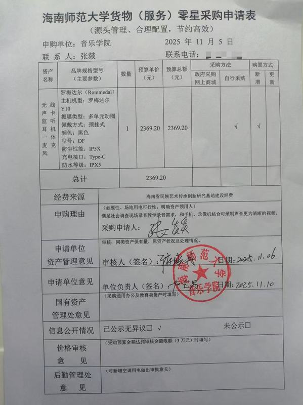 海南师范大学货物(服务)零星采购申请表公示