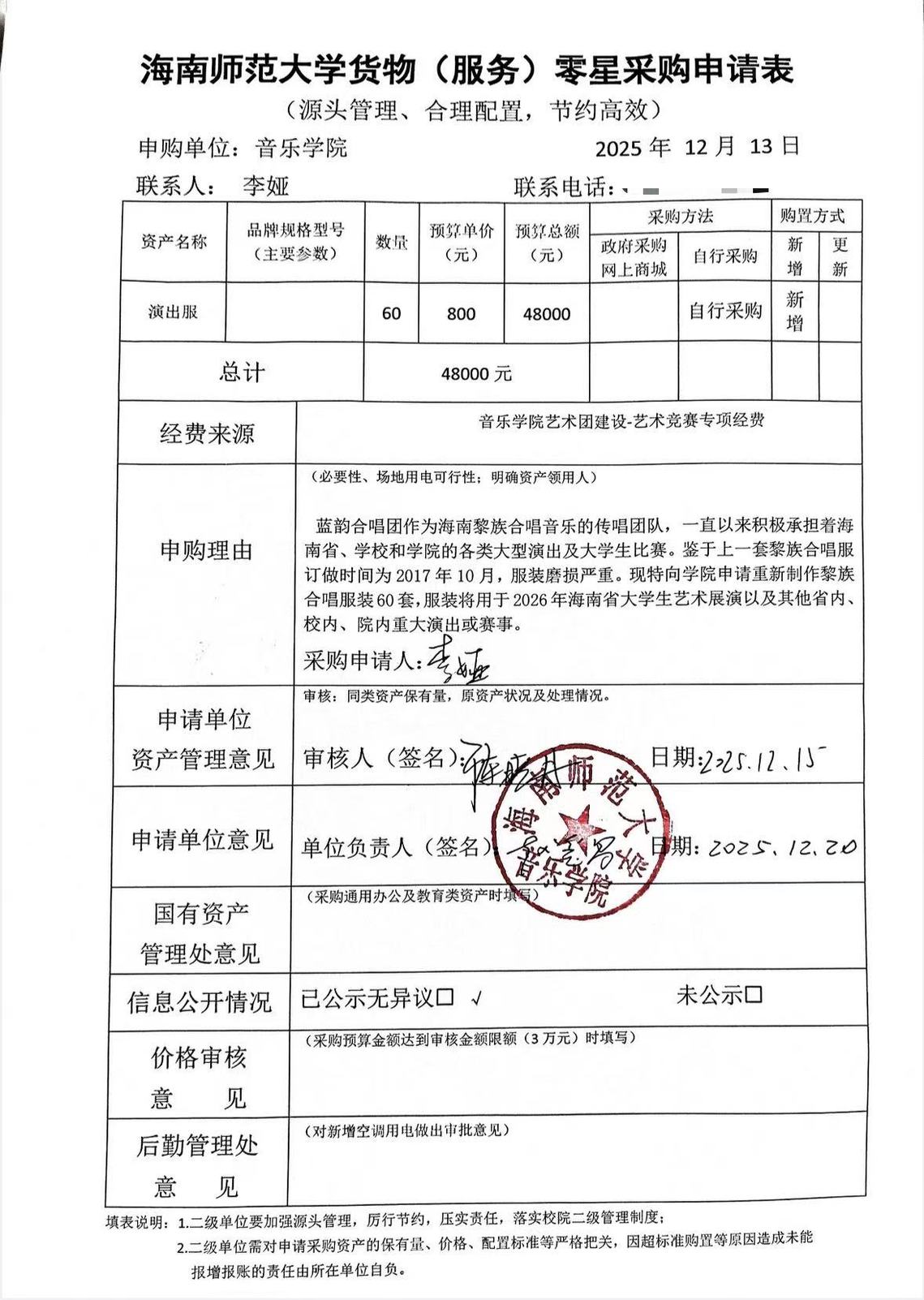 海南师范大学货物(服务)零星采购申请表公示