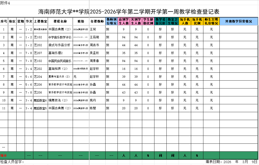 海南师范大学音乐学院2025-2026学年第二学期开学第一周教学检查登记表