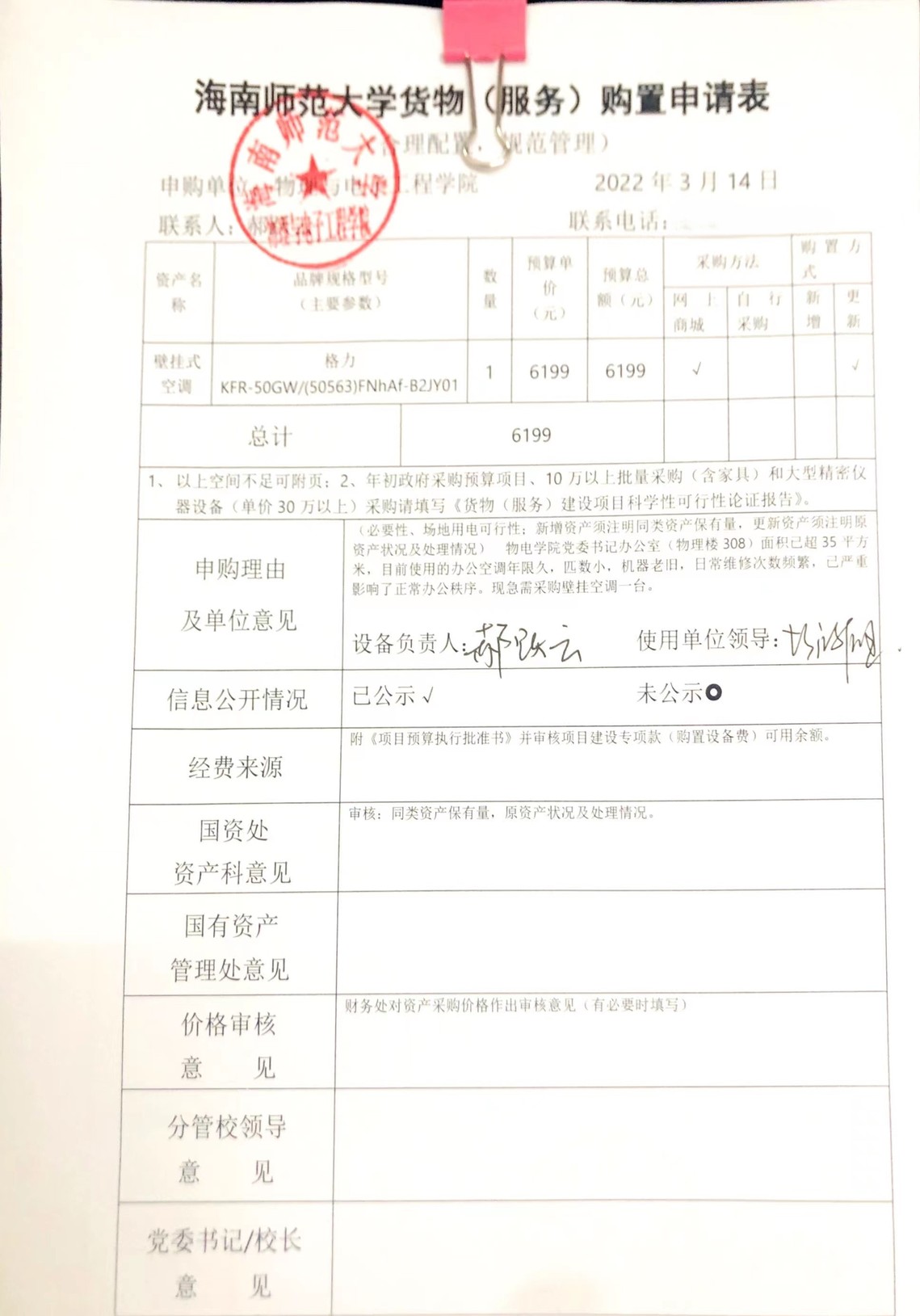 物理与电子工程学院党委书记办公室(物理楼308)急需采购壁挂式空调一台。公示如下,公示时间:2022年3月14日-3月17日。