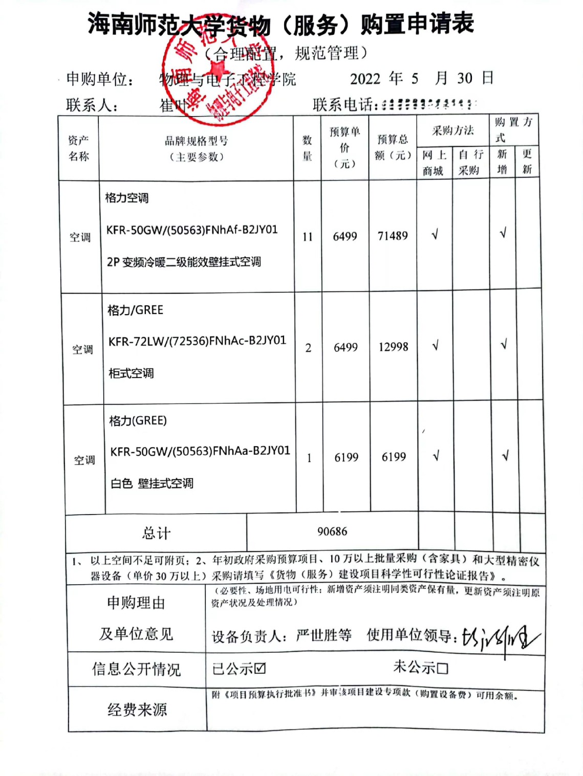 物理与电子工程学院实验室急需采购办公空调14台,公示如下,公示时间:2022年5月30日-6月2日。